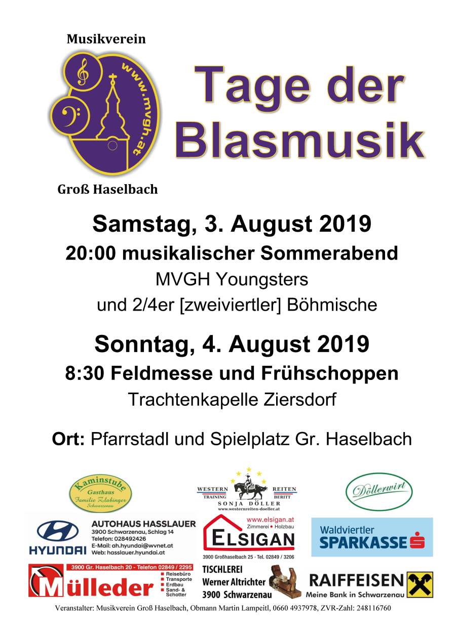 Auch heuer laden wir zu den Tagen der Blasmusik am 3. und 4. August in und rund um den Pfarrstadl in Großhaselbach ein.