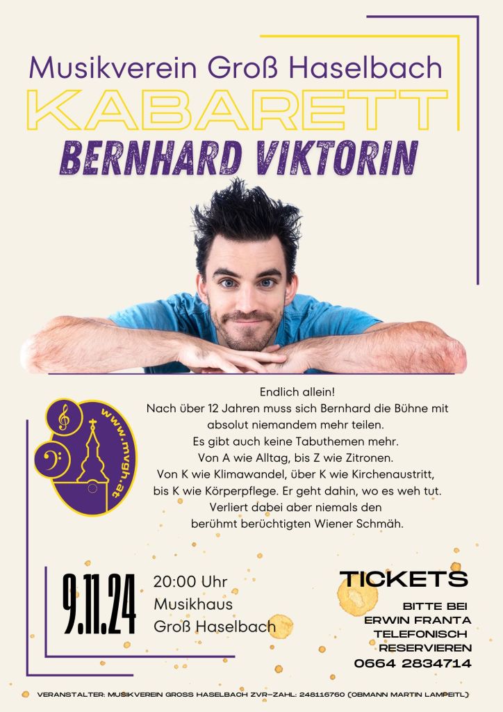 Kultur liegt uns am Herzen – und ihm auf der Zunge! Bernhard Viktorin lädt mit seinem Programm „Endlich allein!“ ins Musikhaus Groß Haselbach ein.