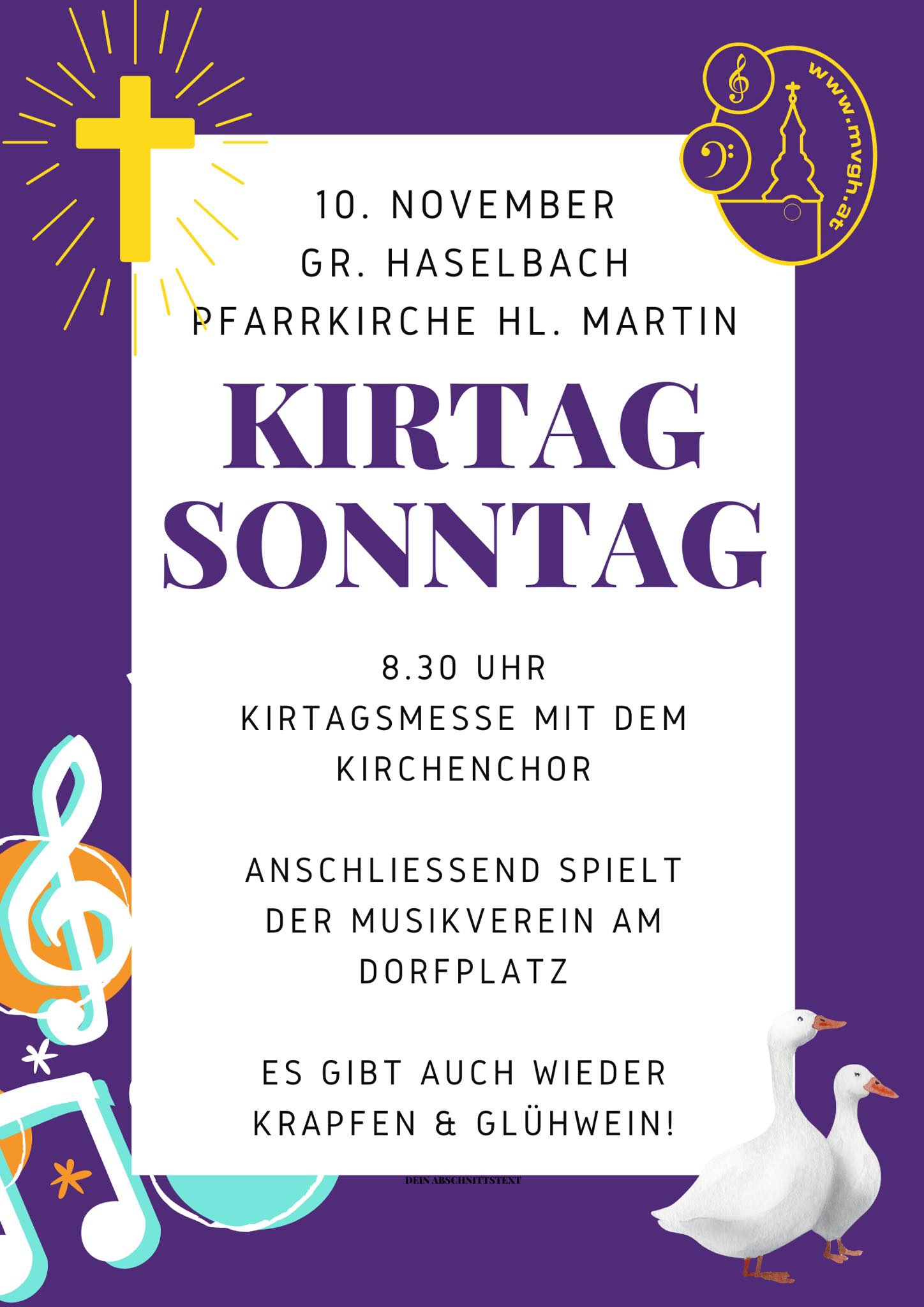Unsere Kirche in Groß Haselbach ist dem Heiligen Martin geweiht, deshalb feiern wir rund um seinen Weihtag am 11. November traditionell den Kirtagsonntag. Der Kirchenchor singt die Kirtagsmesse, wir spielen anschließend ein paar Stücke am Dorfplatz. Dazu gibt’s Heißgetränke und Krapfen. Eine Tradition, die wir sehr gerne pflegen!